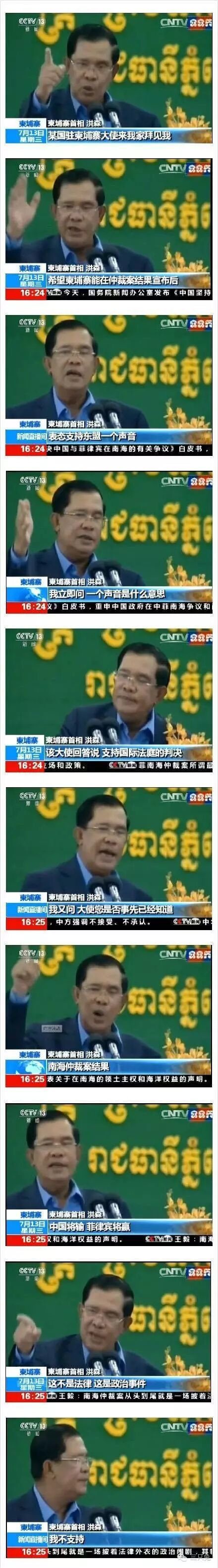 昨日早上,中国总理李克强会见柬埔寨首相洪森时说,在所谓菲律宾南海仲裁案问题上,柬方秉持客观公正立场,仗义执言,捍卫了真正的国际法治和地区规则秩序,为维护中国-东盟关系大局和地区和平稳定发挥了不可替代的作用。中方将继续致力于同直接当事国通过谈判协商解决争议,同东盟国家一道维护南海地区和平稳定与航行自由。 洪森说,柬方将坚持客观公正立场,支持直接当事国通过对话协商解决具体争议。